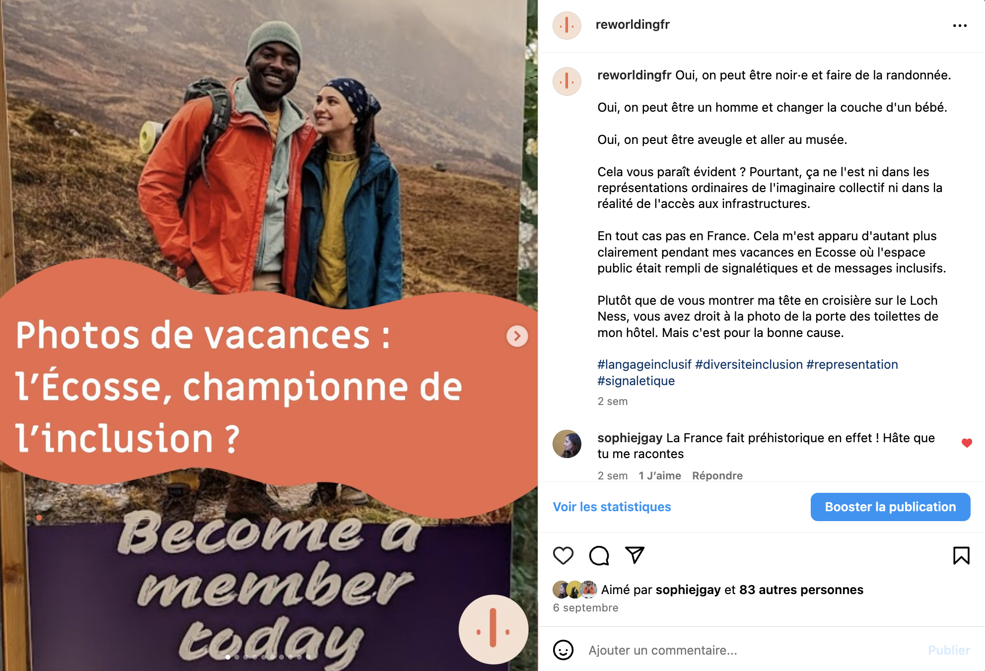 Pour le retour de la newsletter re·wor·l·ding, je vous partage 3 souvenirs de vacances : l'Écosse et son espace public inclusif, la petite phrase que vous n'avez peut-être pas entendue pendant les JO, et les nouveaux ajouts à ma galerie de pubs inclusives. En cadeau, une invitation se cache dans cet email. Saurez-vous la retrouver ?