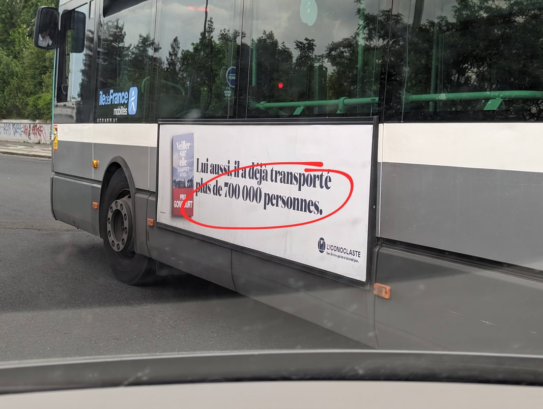 Cela étant dit, même si ce féminin reflète la réalité du lectorat, je pense qu’il serait intéressant d’explorer des formulations inclusives qui déconstruisent l’association systématique de la littérature qui parle d’amour (et plus généralement des émotions, de la vulnérabilité, des sentiments) avec un lectorat féminin. Cette publicité pour le dernier Goncourt, Veiller sur elle de Jean-Baptiste Andrea est un exemple parfait : “Lui aussi, il a déjà transporté plus de 700 000 personnes”.