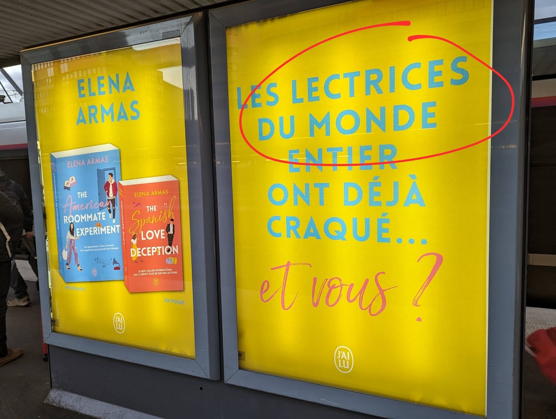 Ce qui m’a frappé récemment alors que je prenais comme d’habitude des photos de publicités dans le métro et dans la rue, c’est d’observer comment les mots “lecteurs” et “lectrices ” sont eux-mêmes mobilisés dans le marketing genré des livres. Avoir une réflexion critique sur l’utilisation de ces mots permet d’illustrer 3 principes et stratégies du langage inclusif que les maisons d’éditions devraient considérer.